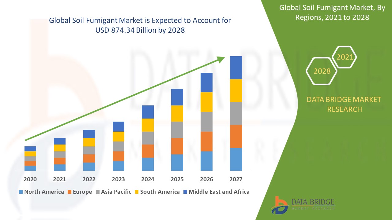 Soil fumigant market is expected to reach USD 874.34 billion by 2028 growing at a growth rate of 5.10% in the forecast period 2021 to 2028. Increasing demand for food in both developed and developing nations which will likely to act as a factor for the soil fumigant market in the forecast period of 2021- 2028.